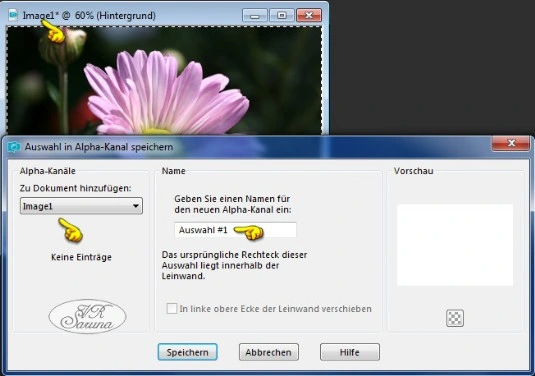 Auswahlen können in PSP in einen Alphakanal gespeichert werden. Diese Methode eignet sich vor allem dann, wenn eine Auswahl nur kurzzeitig benötigt wird. Beispielsweise, wenn man aus zwei unterschiedlichen Bildformaten zwei gleich große Bilder benötigt werden - wie in meinem Tutorial Blend 01.