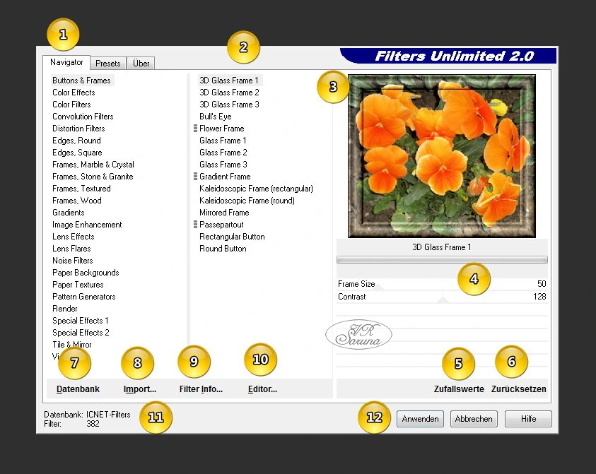 Diese schaut immer gleich aus - egal, in welcher Bildbearbeitung du den FU nutzt. Der nachfolgende Screen zeigt das Arbeitsfenster mit einer geöffneten Filter-Datenbank. Bei der Datenbank ICNET-Filters handelt es sich um die eigenen Filter des FU, die bei der Installation mit dabei sind.