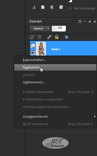Dazu zieht man die gewünschte Ebene mit festgehaltener linken Maustaste auf die gewünschte Stelle und lässt los. Es wird immer ein Doppel der Ebene erstelle; die Original-Ebene bleibt bestehen.
