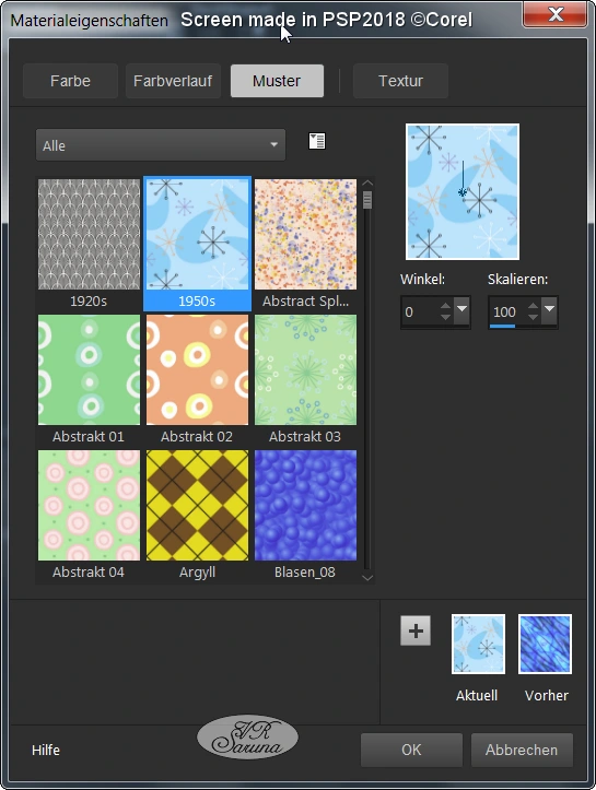Sicher gibt es noch viel mehr über die Materialpalette zu berichten, so vielseitige Möglichkeiten bietet sie zum Arbeiten, aber hier rate ich entweder zu einem Blick in die Programmhilfe oder zum Besuch der PSP-Schule bei Tutoholic-Style.de. Dort lernt man alles, was der digitale Bastlers so braucht für Rahmen, Signtags, Minipixel und ähnliche.
